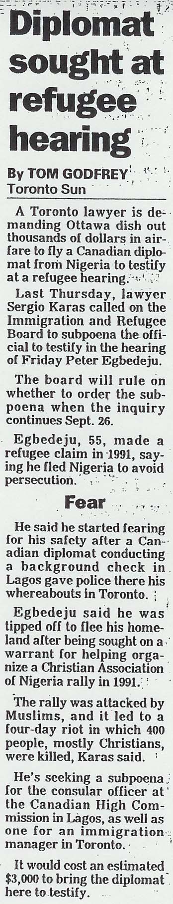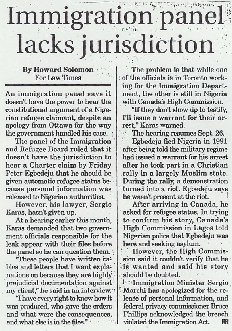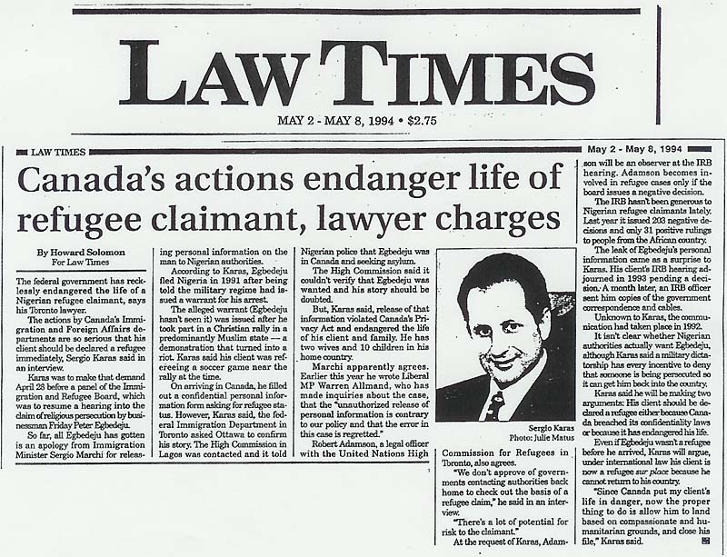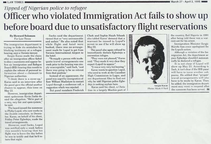 | Tipped off Nigerian police to refugee | Law Times (Canada) | 27-Mar-95 | Download |