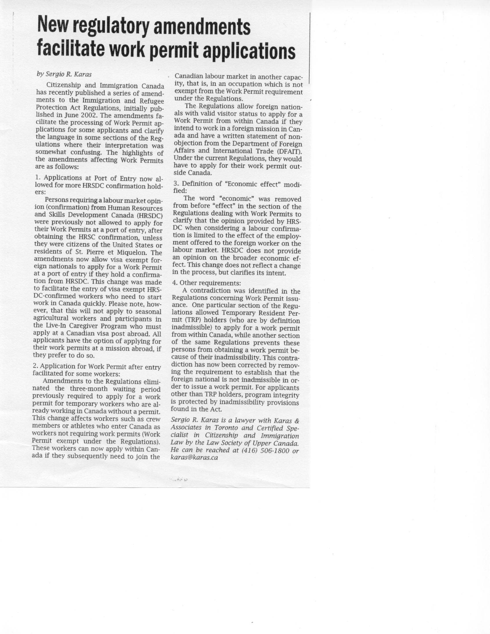 | New Regulatory Amendments Facilitate Work Permit App | The Bay Street Times (Canada) | 16-Nov-04 | Download |