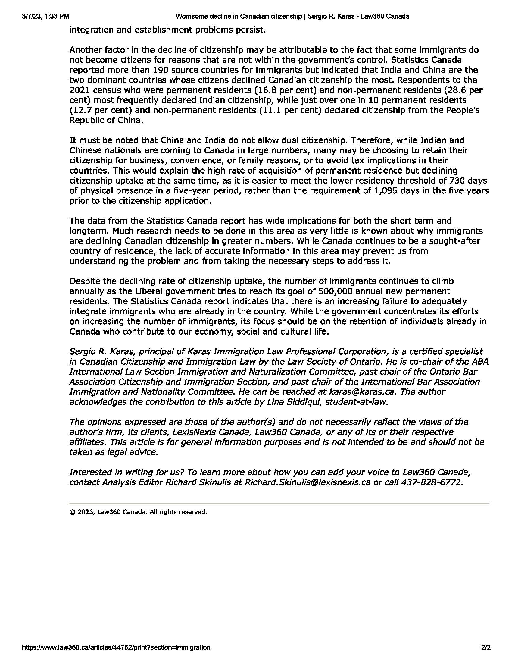 | Worrisome decline in Canadian citizenship | Law360 (Canada ) | 07-Mar-23 | Download |