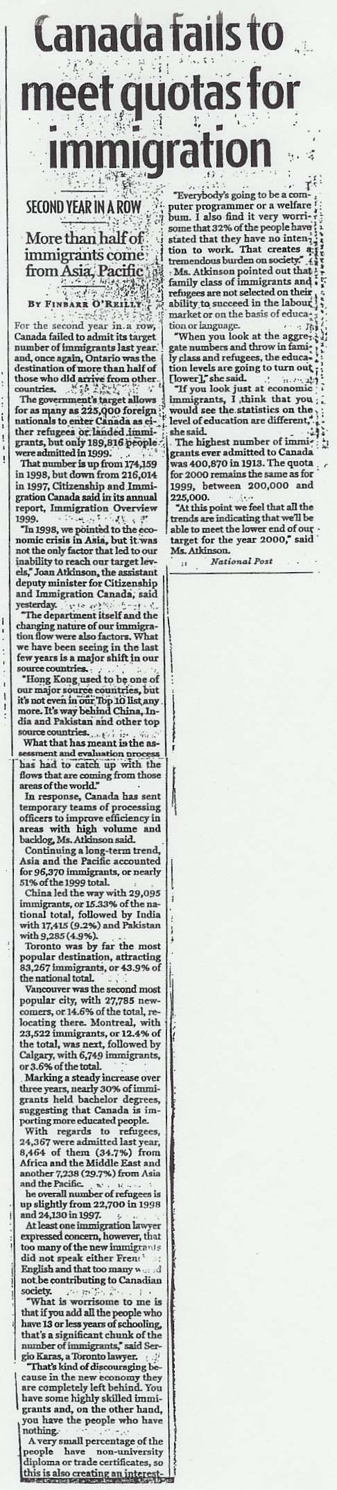 | Canada fails to meet quotas for immigration | National Post (Canada) | 01-Sep-00 | Download |