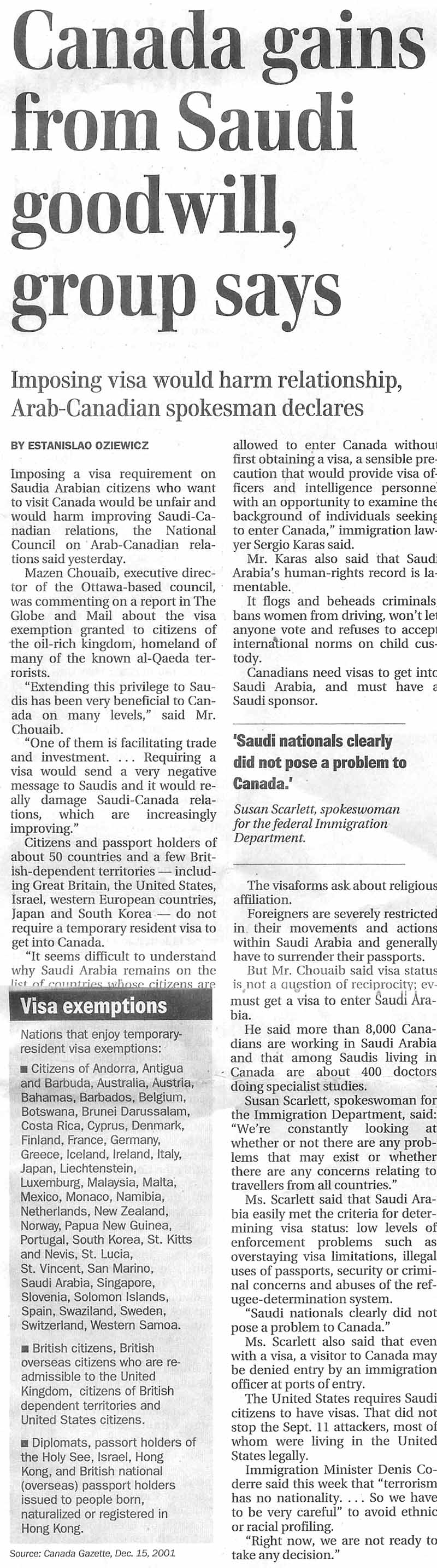 | "Canada gains from Saudi goodwill", group says | The Globe and Mail | 08-Feb-02 | Download |