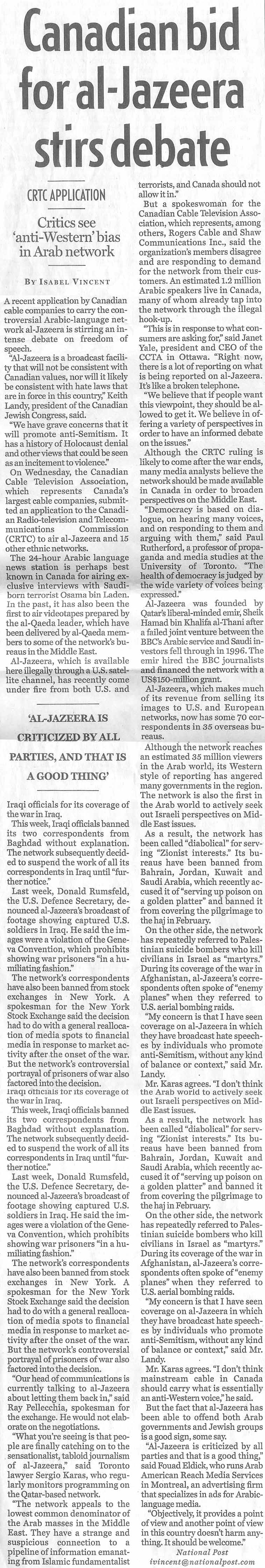 | Canadian Bid for al-Jazzera Stirs debate | National Post (Canada) | 04-Apr-03 | Download |