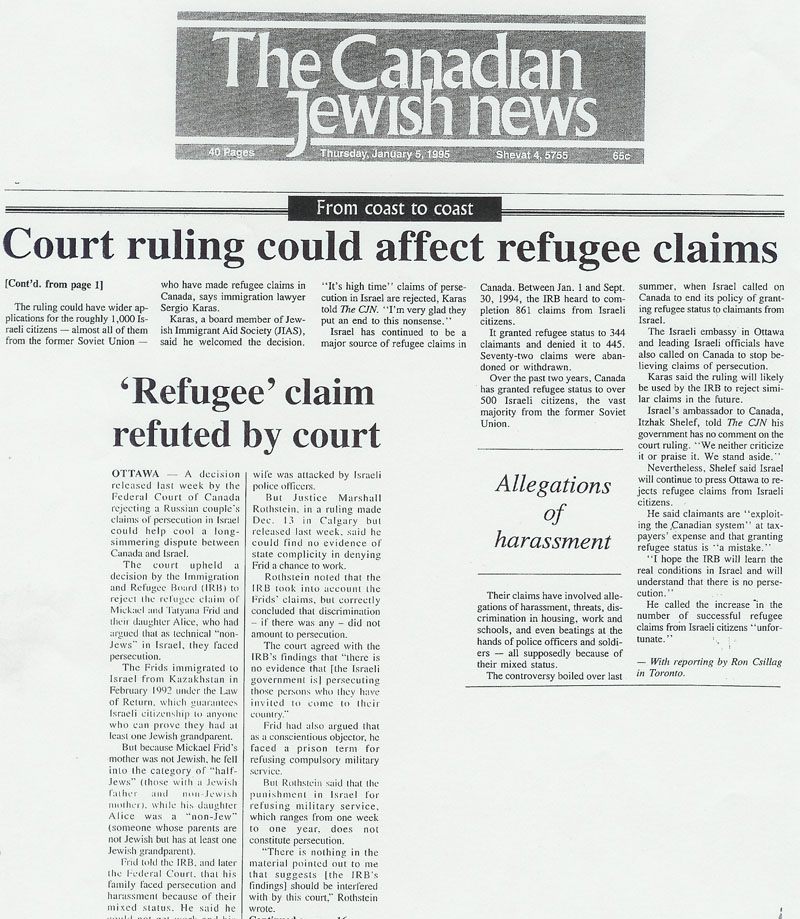 | Court ruling could affect refugge claims | The Canadian Jewish News (Canada) | 05-Jan-95 | Download |
