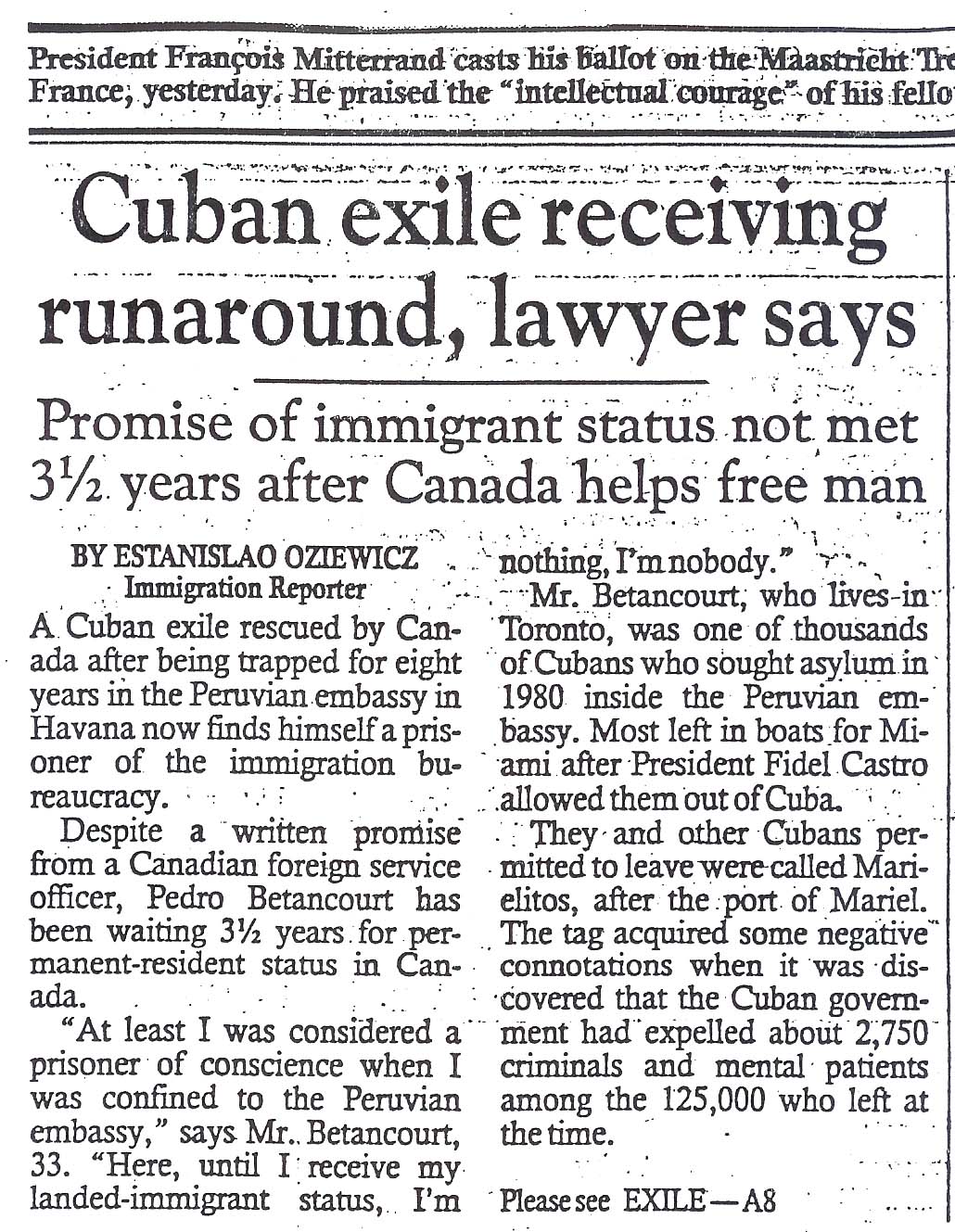 | Cuban exile receiving runaround, lawyer says | The Globe and Mail (Canada) | 21-Oct-92 | Download |