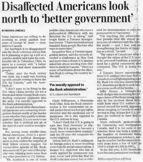 | Disaffected Americans Look north to Better Government | The Globe and Mail ( Canada) | 04-Nov-04 | Download |