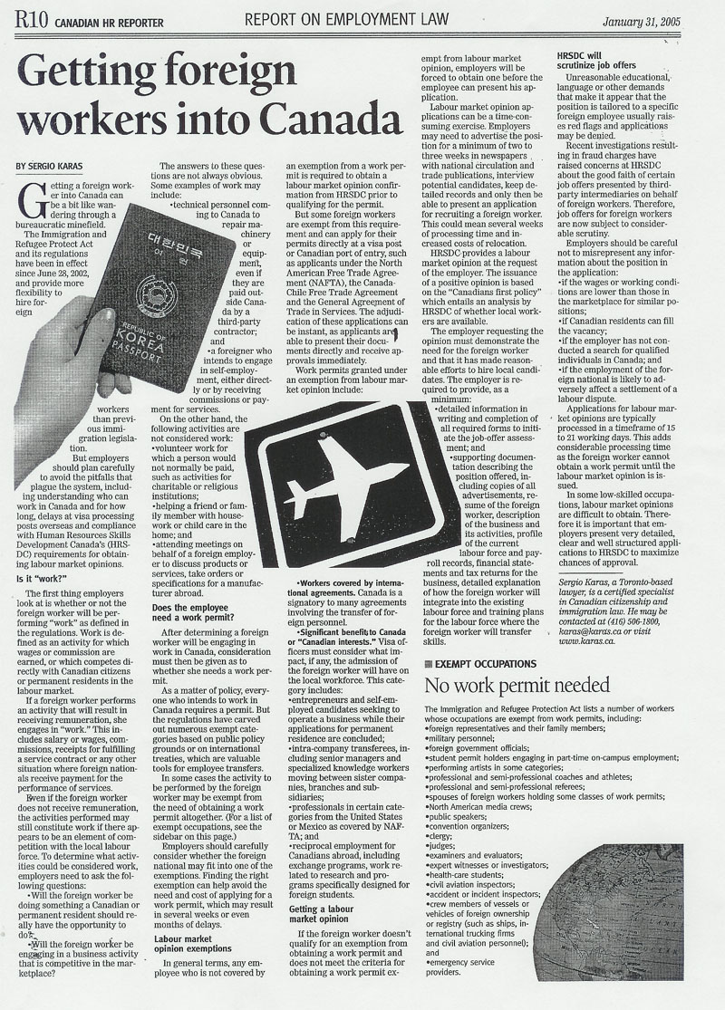 | Getting Foreign Workers into Canada | Canadian HR Reporter (Canada) | 31-Jan-05 | Download |