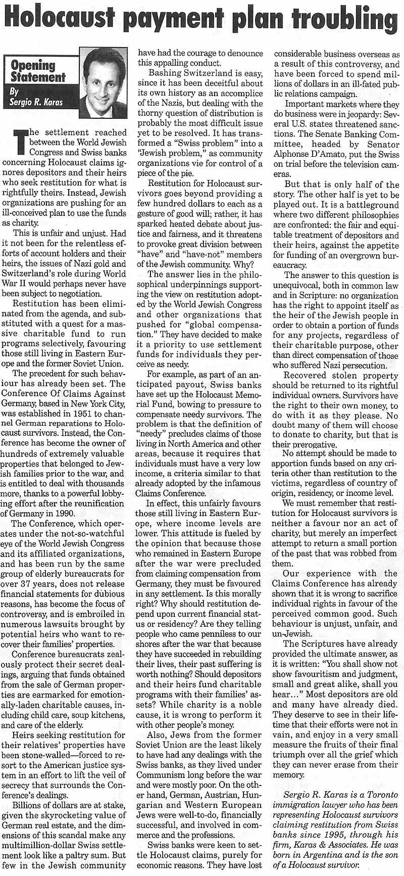 | Swiss Settlement Opposed | The Canadian Jewish News (Canada) | 30-Oct-97 | |