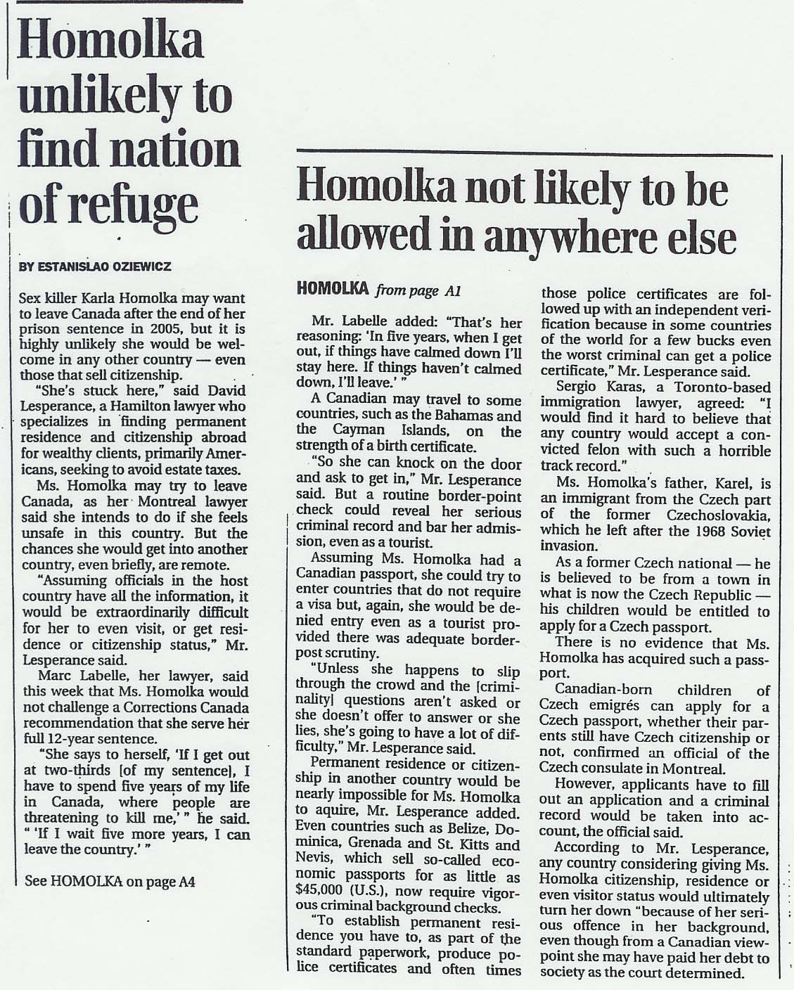 | Homolka Unlikely to Find Nation of Refuge | The Globe & Mail (Canada) | 05-Jan-01 | Download |