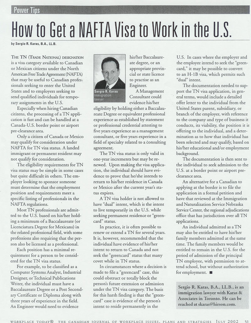 | How to Get a Nafta Visa to Work in the US | Workplace Issues (Canada) | 01-Jul-02 | Download |