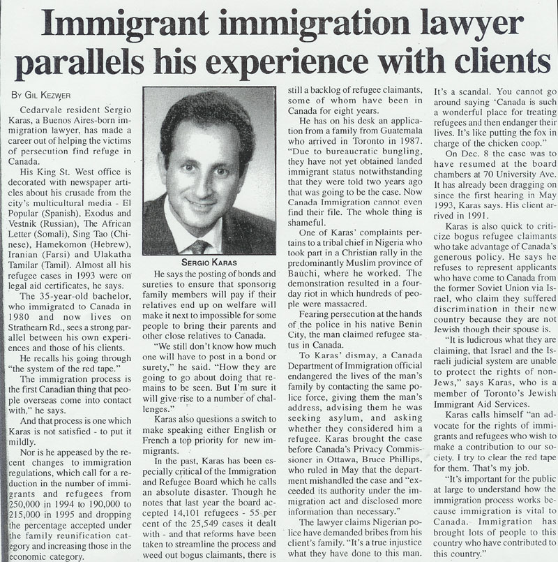 | Immigrant immigration lawyer parallels his experience with clients | Town Crier (Canada) | 01-Nov-95 | Download |