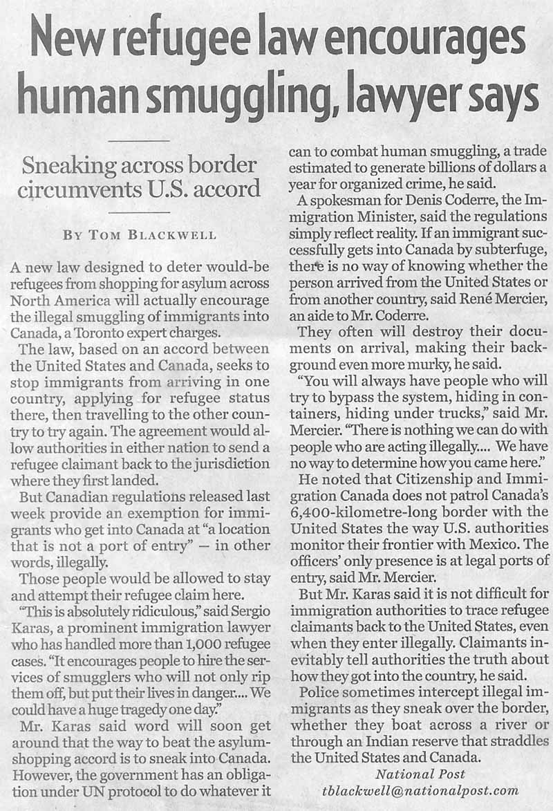 | New Refugee Law Encourages Human Smuggling", Lawyer Says | National Post (Canada) | 11-Nov-02 | Download |