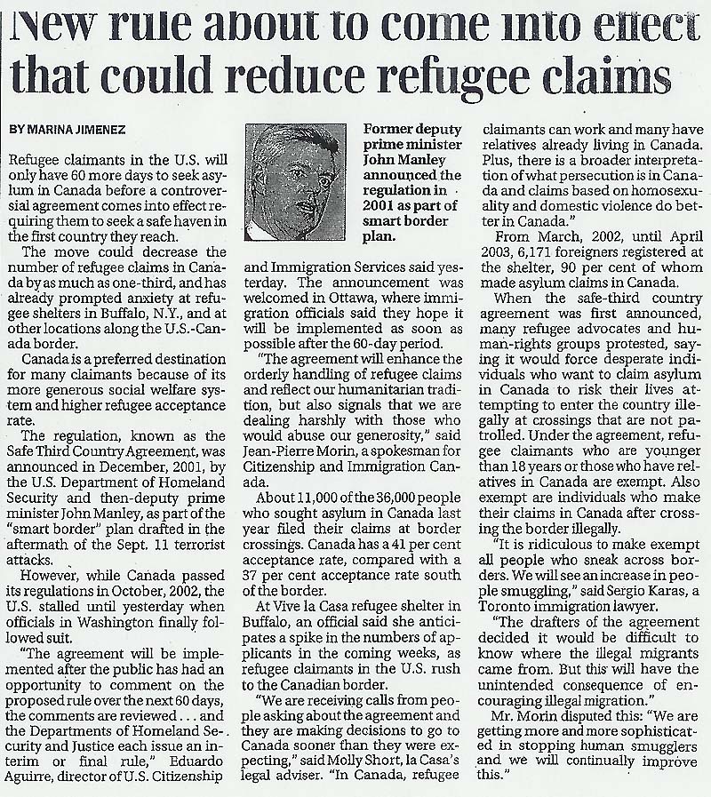 | New Rule about to come into effect that reduce refugee claims | The Globe and Mail (Canada) | 09-Mar-04 | Download |