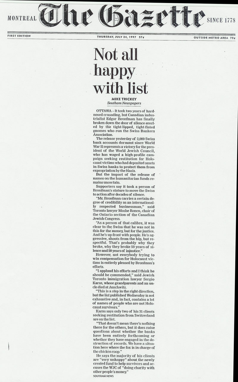 | Canadians pore over Swiss bank-account list | The Globe and Mail (Canada) | 24-Jul-97 | |