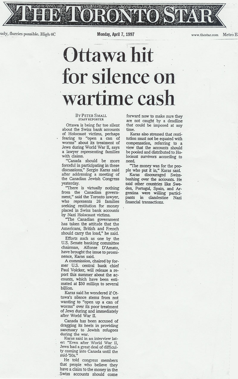 | Ottawa hit for silence on wartime cash | The Toronto Star (Canada) | 07-Apr-97 | Download |
