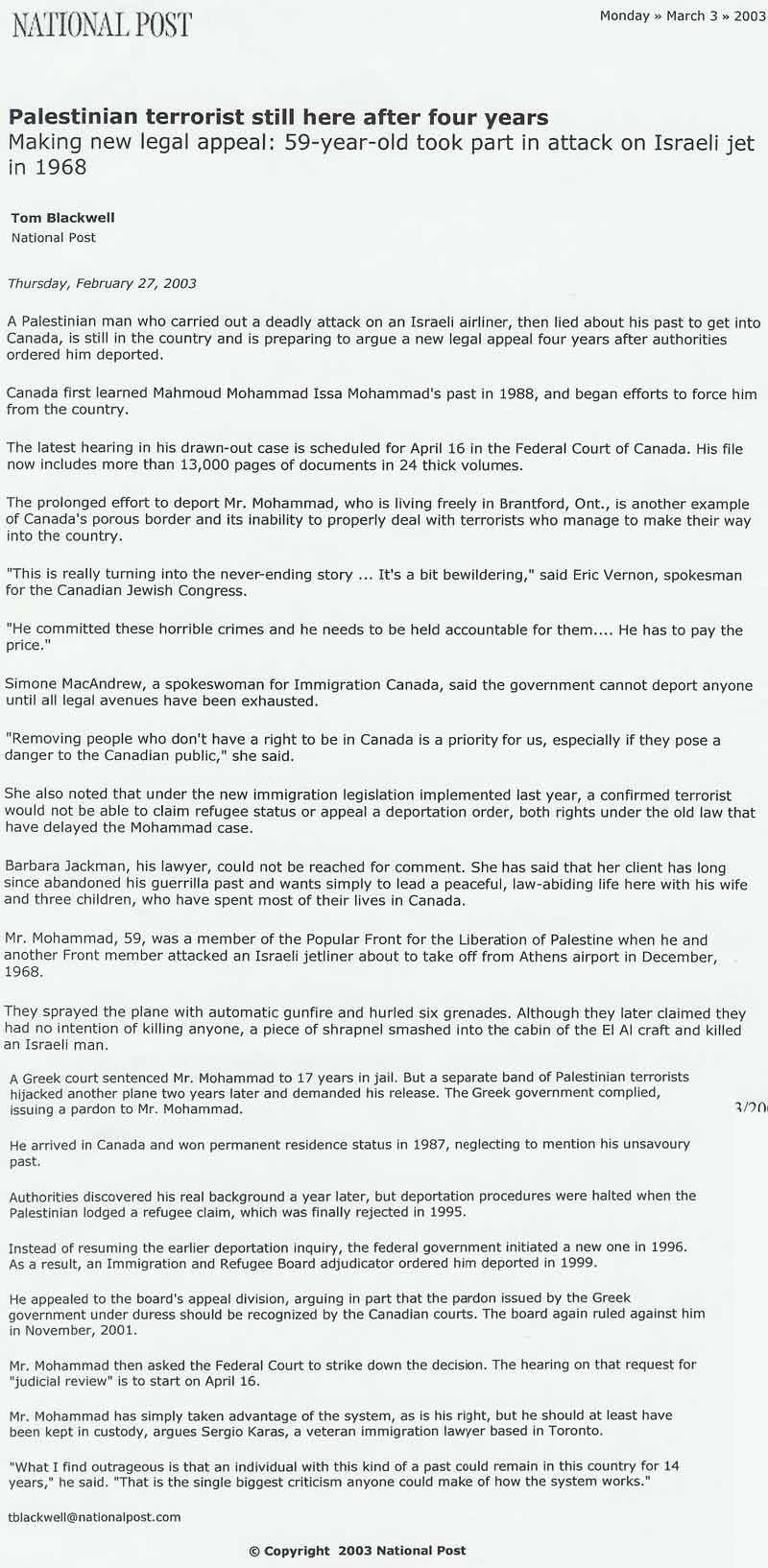 | Palestinian Terrorist Still Here After Four Years | National Post (Canada) | 27-Feb-03 | Download |
