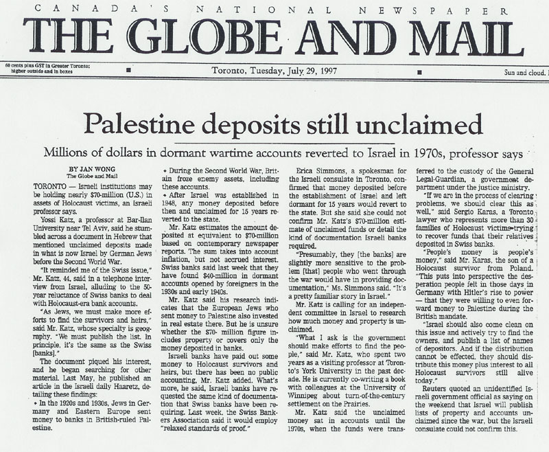 | Palestine deposits still unclaimed | The Globe and Mail (Canada) | 29-Jul-97 | Download |