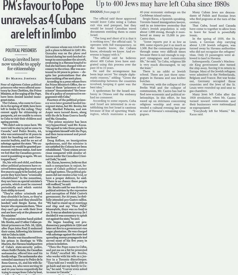 | PM's favor to Pope unravels as 4 Cubans are left in limbo | National Post (Canada) | 30-Sep-99 | Download |