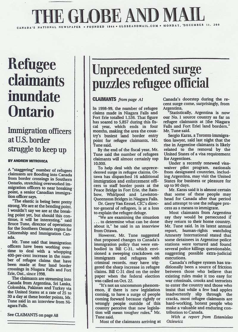 | Refugee Claimants inundate Ontario | The Globe and Mail (Canada) | 11-Dec-00 | Download |