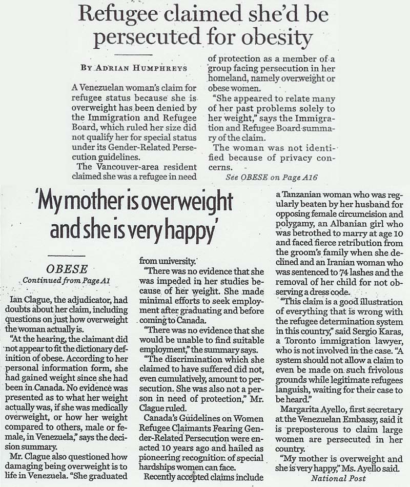 | Refugee Claimed She'd be Persecuted for Obesity | National Post (Canada) | 21-Aug-03 | Download |