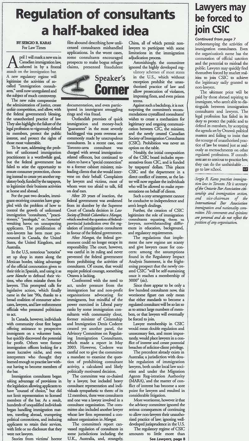 | Regulation of consultants a half-baked idea | Law Times (Canada) | 15-Mar-04 | Download |