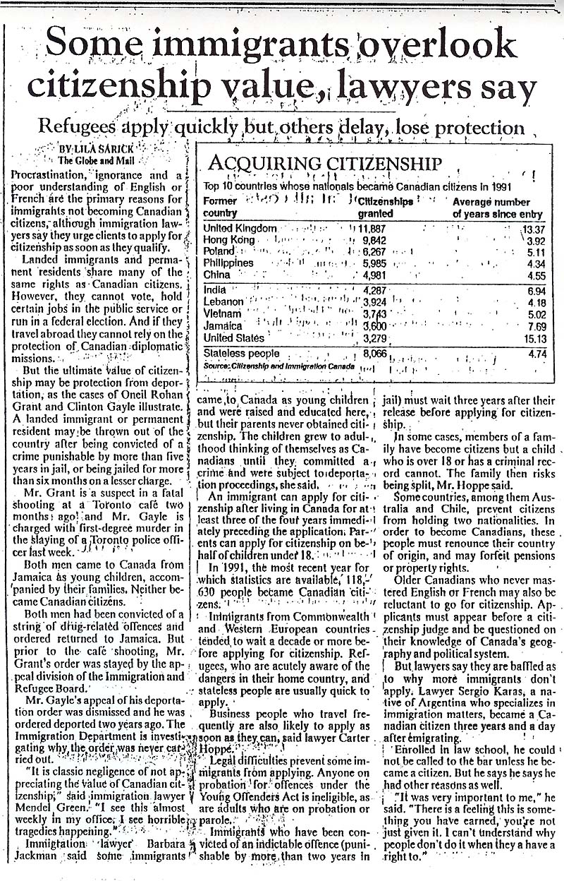 | Some immigrants ogerlook citizenship value, lawyer says | The Global and Mail (Canada) | 22-Jun-94 | Download |