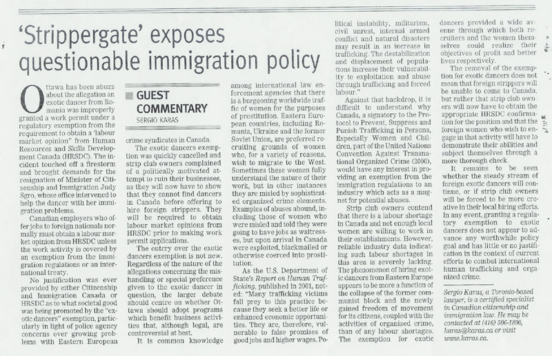 | 'Strippergate' exposes questionable immigration policy | Canadian HR Reporter (Canada) | 20-Dec-04 | Download |