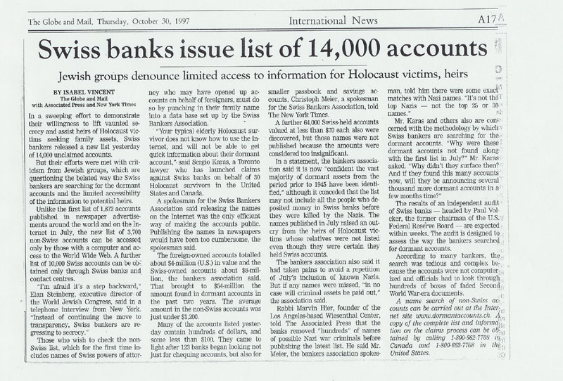 | Swiss banks issue list of 14,000 accounts | The Globe and Mail (Canada) | 30-Oct-97 | Download |