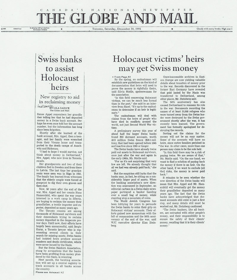 | Swiss banks to assist Holocoust heirs | The Globe and Mail (Canada) | 30-Dec-95 | Download |