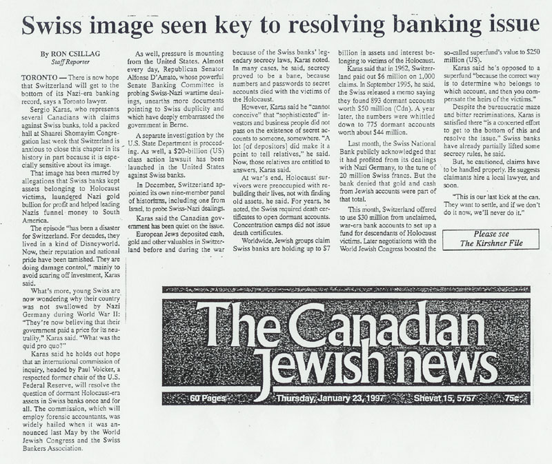 | Swiss image seen key to resolving banking issue | The Canadian Jewish News (Canada) | 23-Jan-97 | Download |