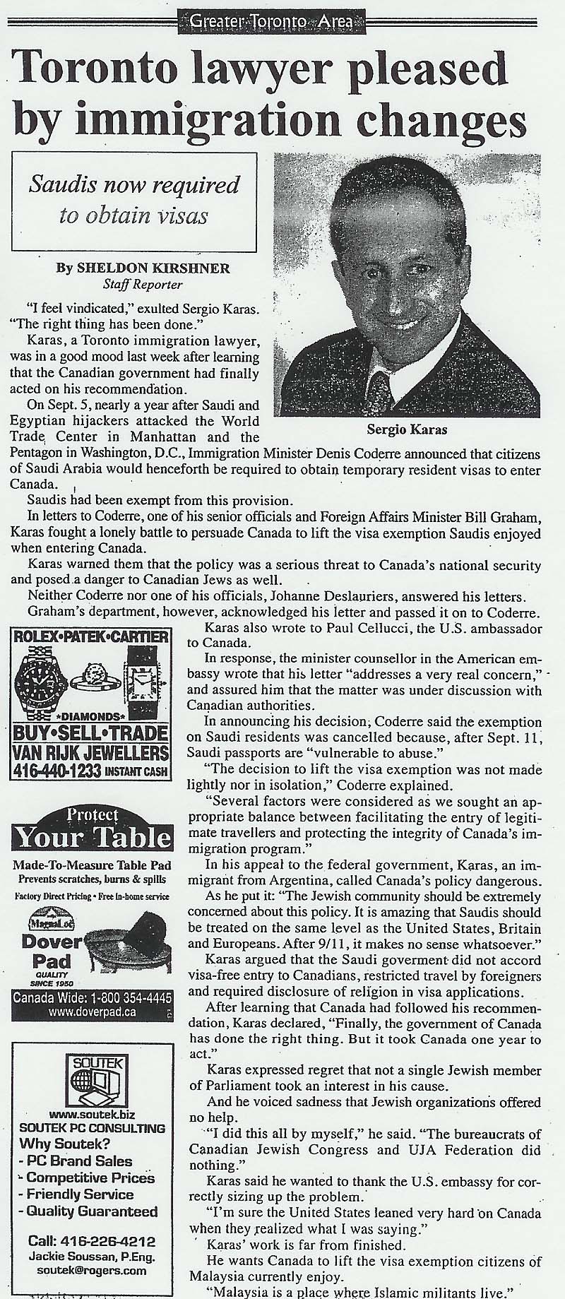 | Lawyer seeks to end visa-free entry for Saudis | The Canadian Jewish News | 11-Jul-02 | Download |