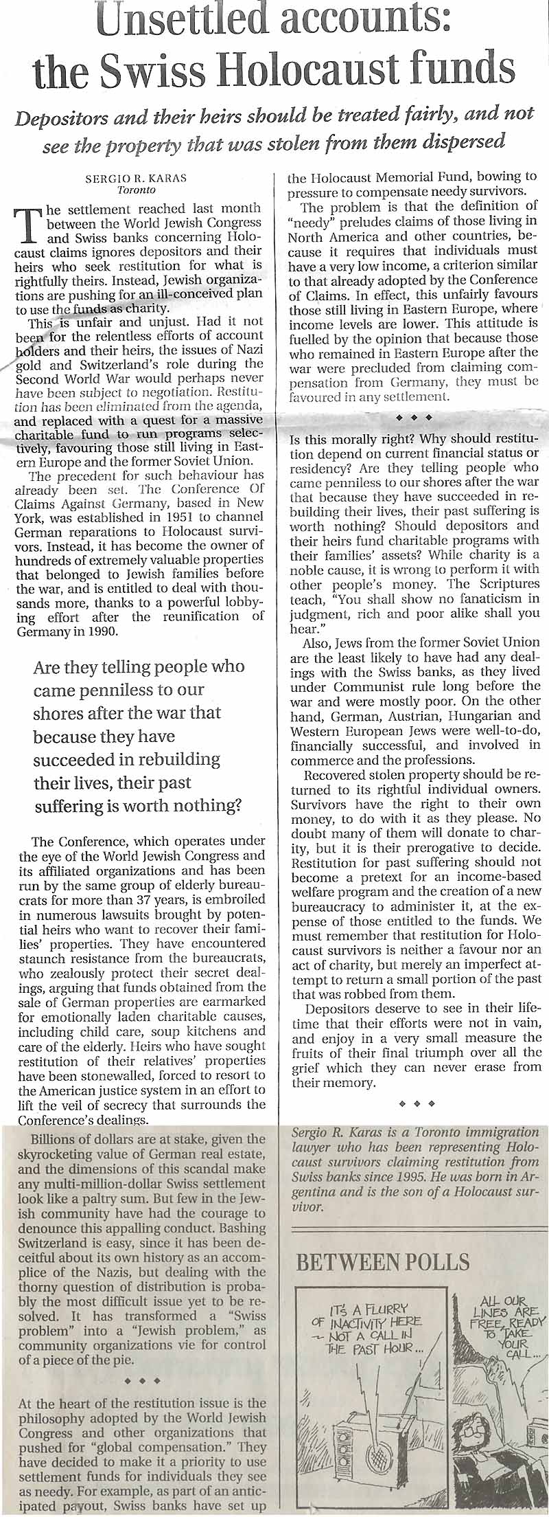 | Unsettled Accounts: The Swiss Holocaust Funds | The Globe and Mail (Canada) | 01-Sep-98 | Download |
