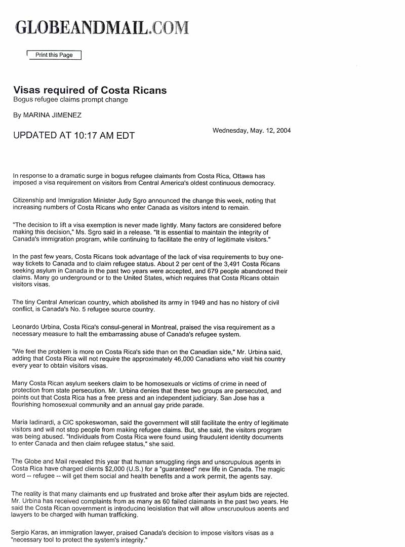 | Visas required for Costa Ricans | National Post (Canada) | 12-Mar-04 | Download |