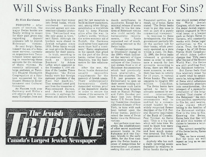 | Will Swiss Banks Finally Recant For Sins? | The Jewish Tribune (Canada) | 27-Feb-97 | Download |
