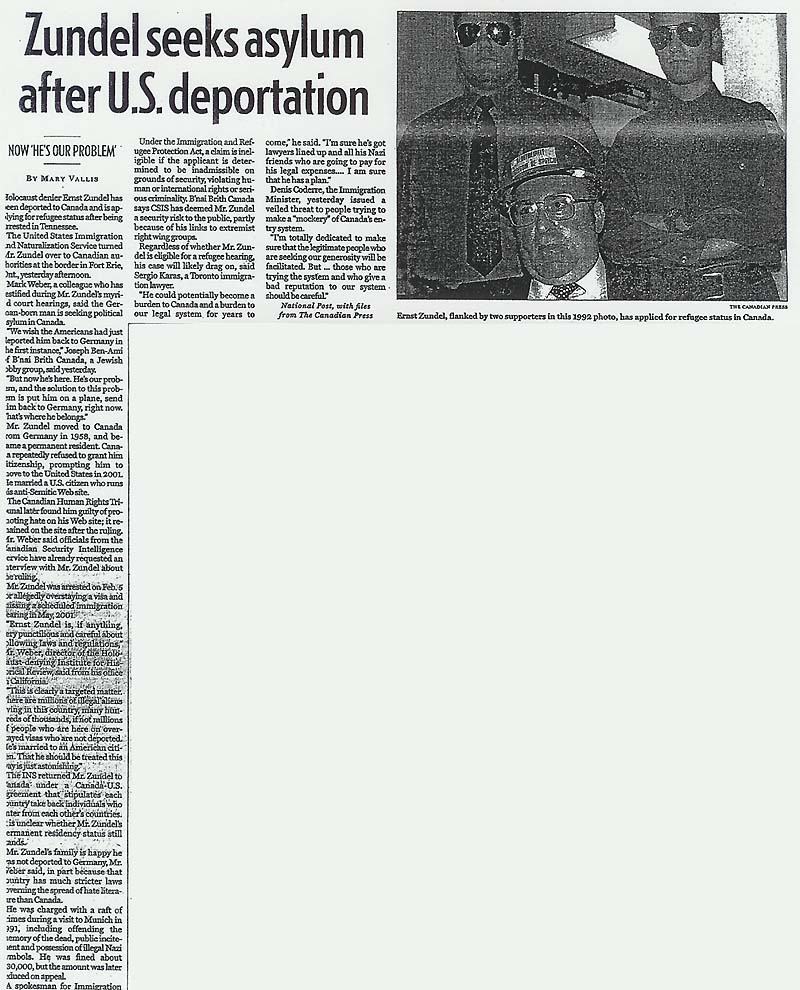 | Zundel Seeks Asylum after U.S. Deportation | National Post (Canada) | 20-Feb-03 | Download |